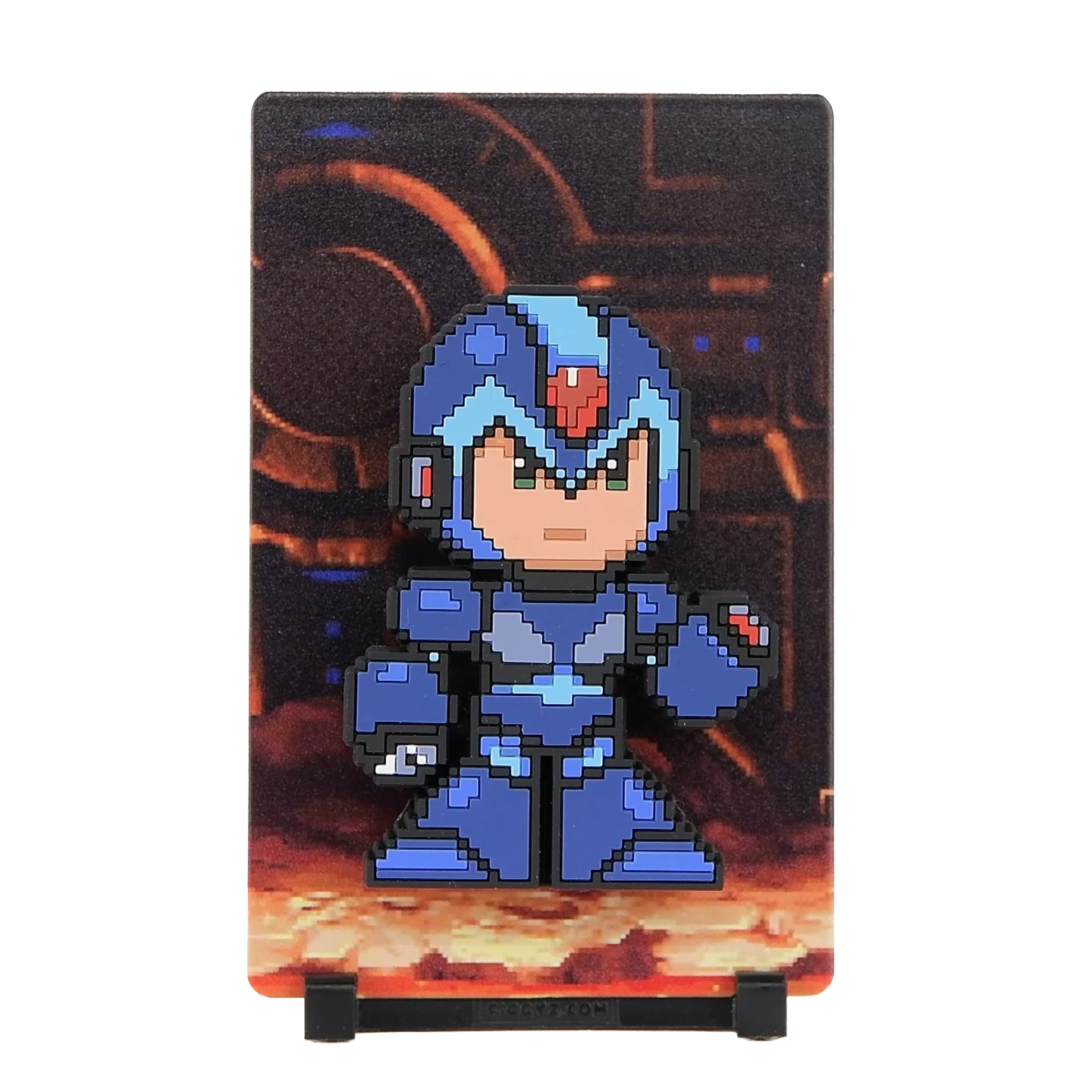 FiGGYZ are made to display like a mini scene: X snaps onto a reversible metal backdrop and “pops” forward with a clean raised 3D look. Set him on the included base for that classic shelf lineup, or mount him somewhere you’ll actually enjoy him—desk setup, game room wall, fridge, locker—instant pixel power wherever you want it.